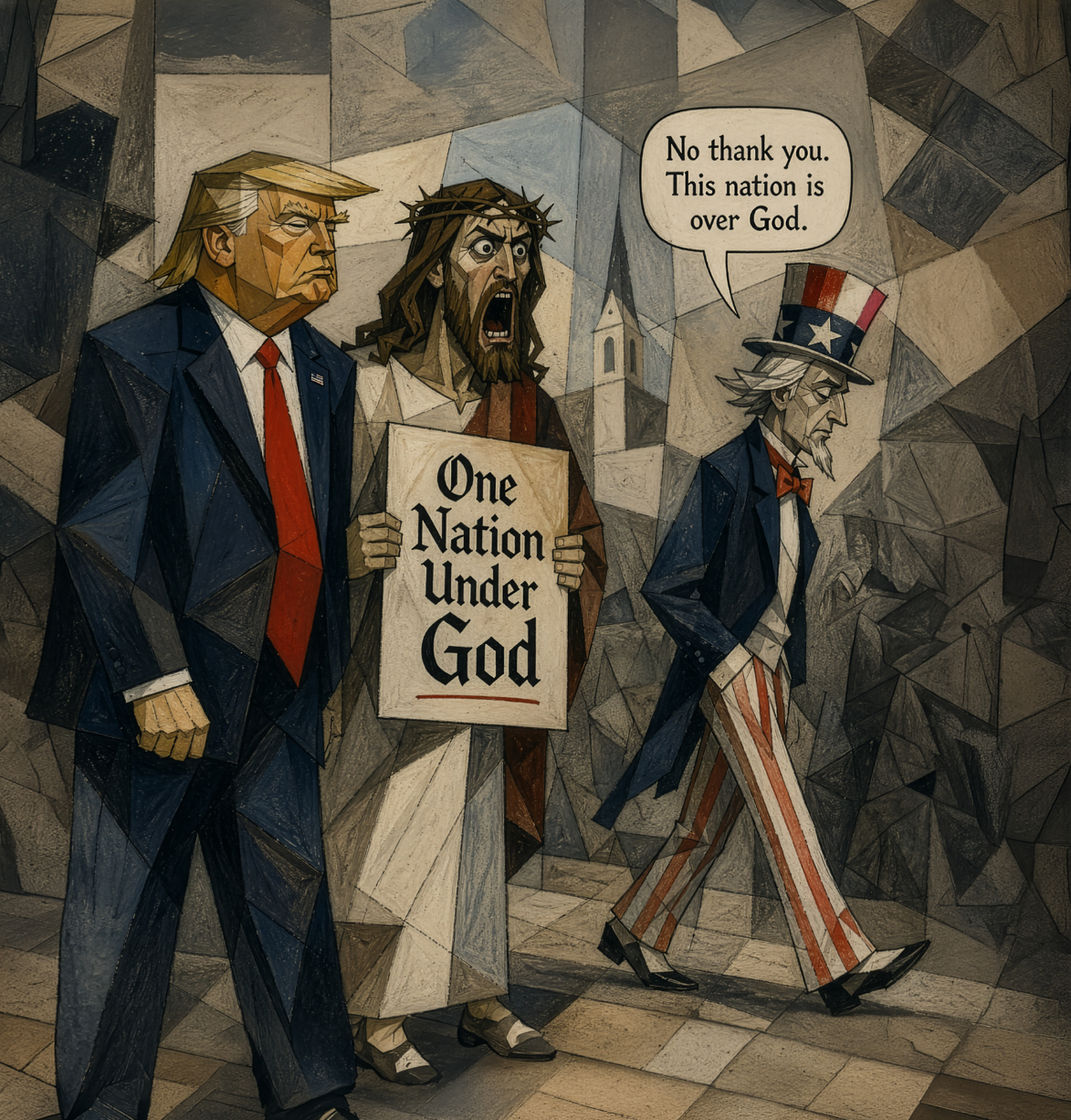 Uncle Sam calmly walks by and says "No thank you. This nation is over God."