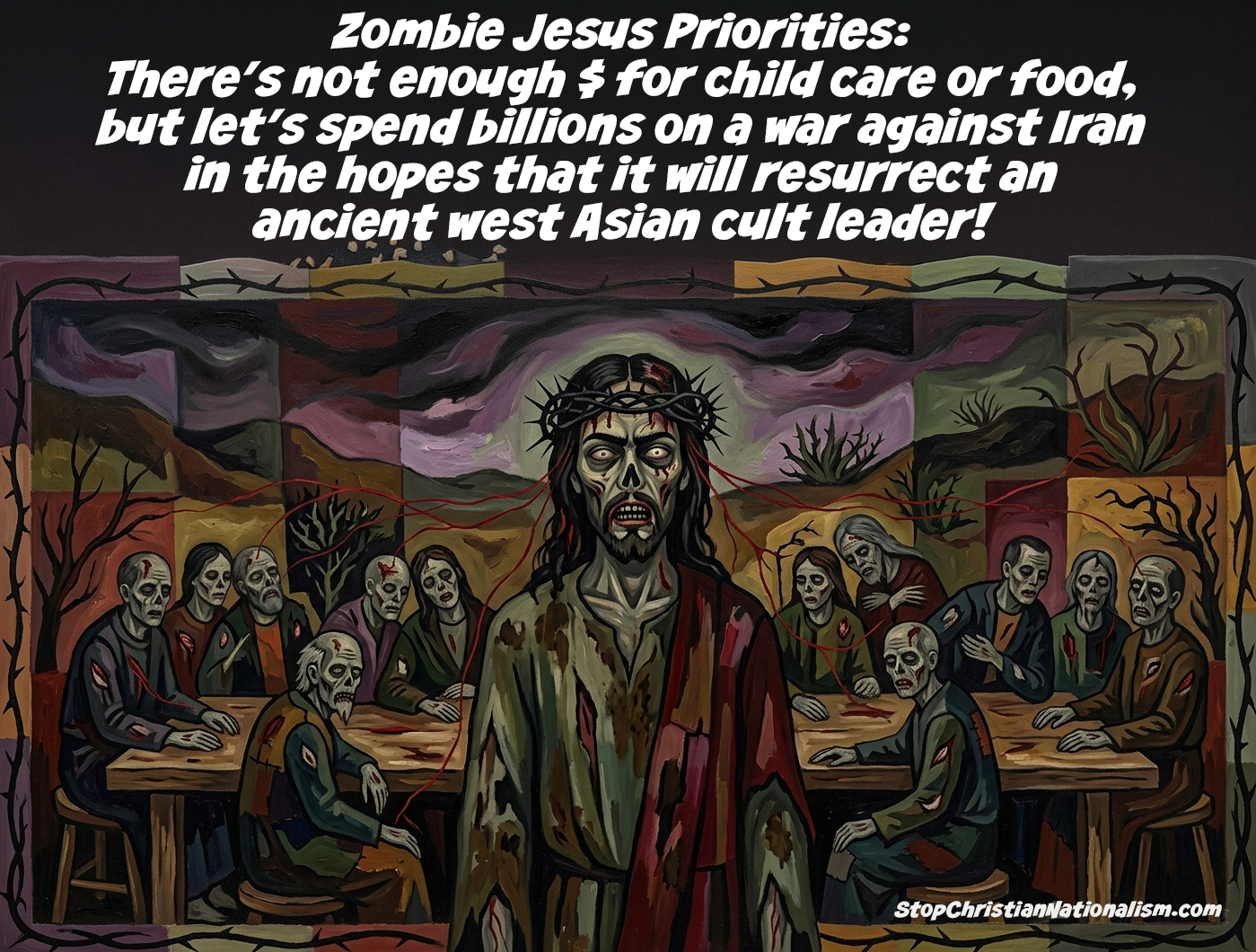Zombie Jesus Priorities: A War Of Resurrection Apr 5 Written By Clifford Cook Zombie Jesus Priorities:There’s not enough money for child care or food,but let’s spend billions on a war against Iran in the hopes that it will resurrect an ancient west Asian cult leader! prioritiesdiscipleszombiebudgetwarcrusadefoodmedicineIran Clifford Cook https://stopchristiannationalism.com