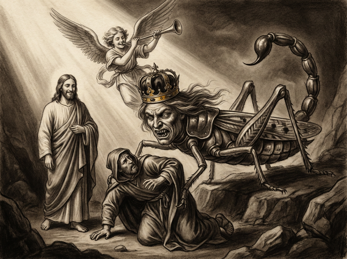 Jesus Christ encouraging the attacks of the locust monsters of the Book of Revelation